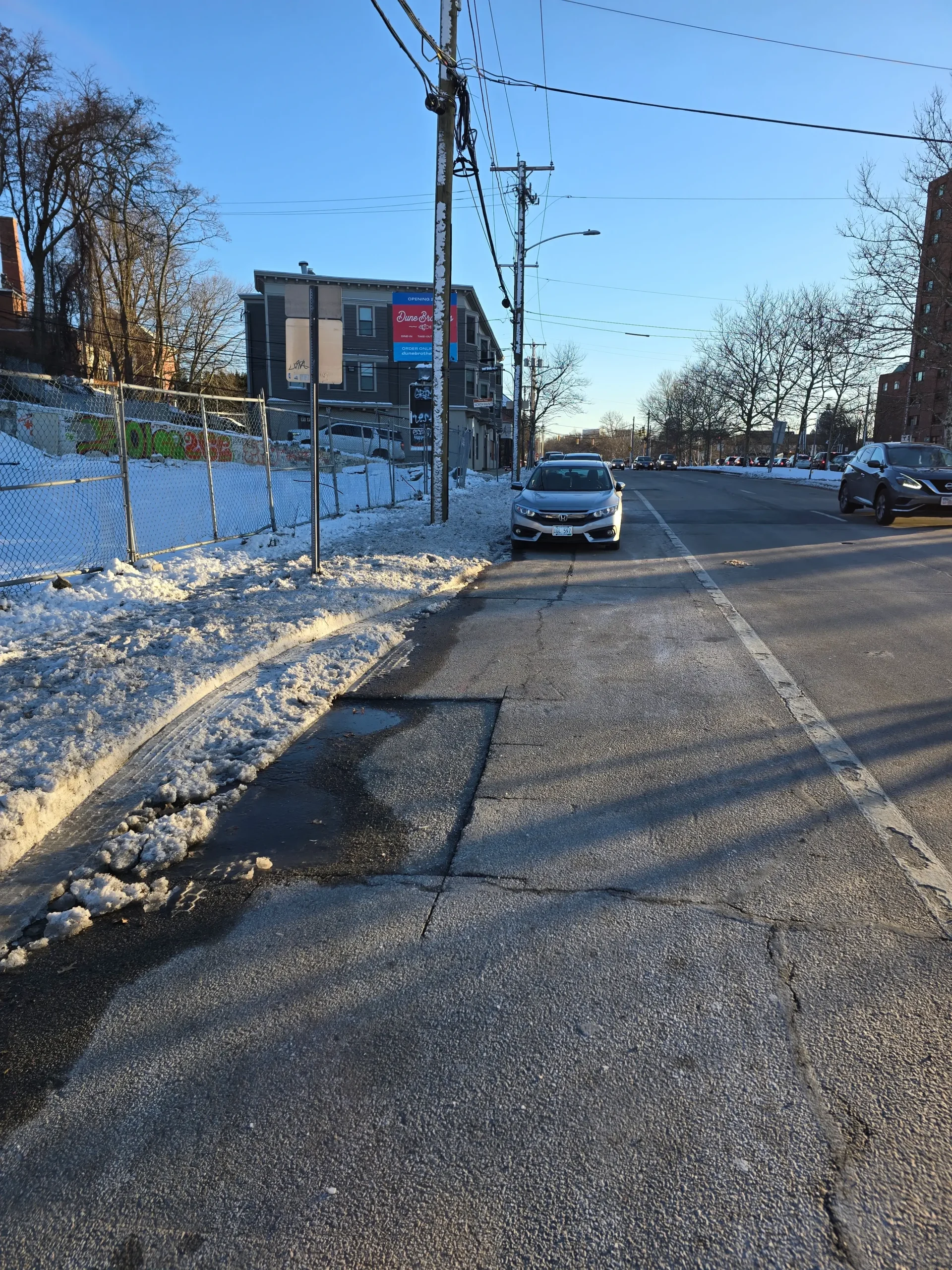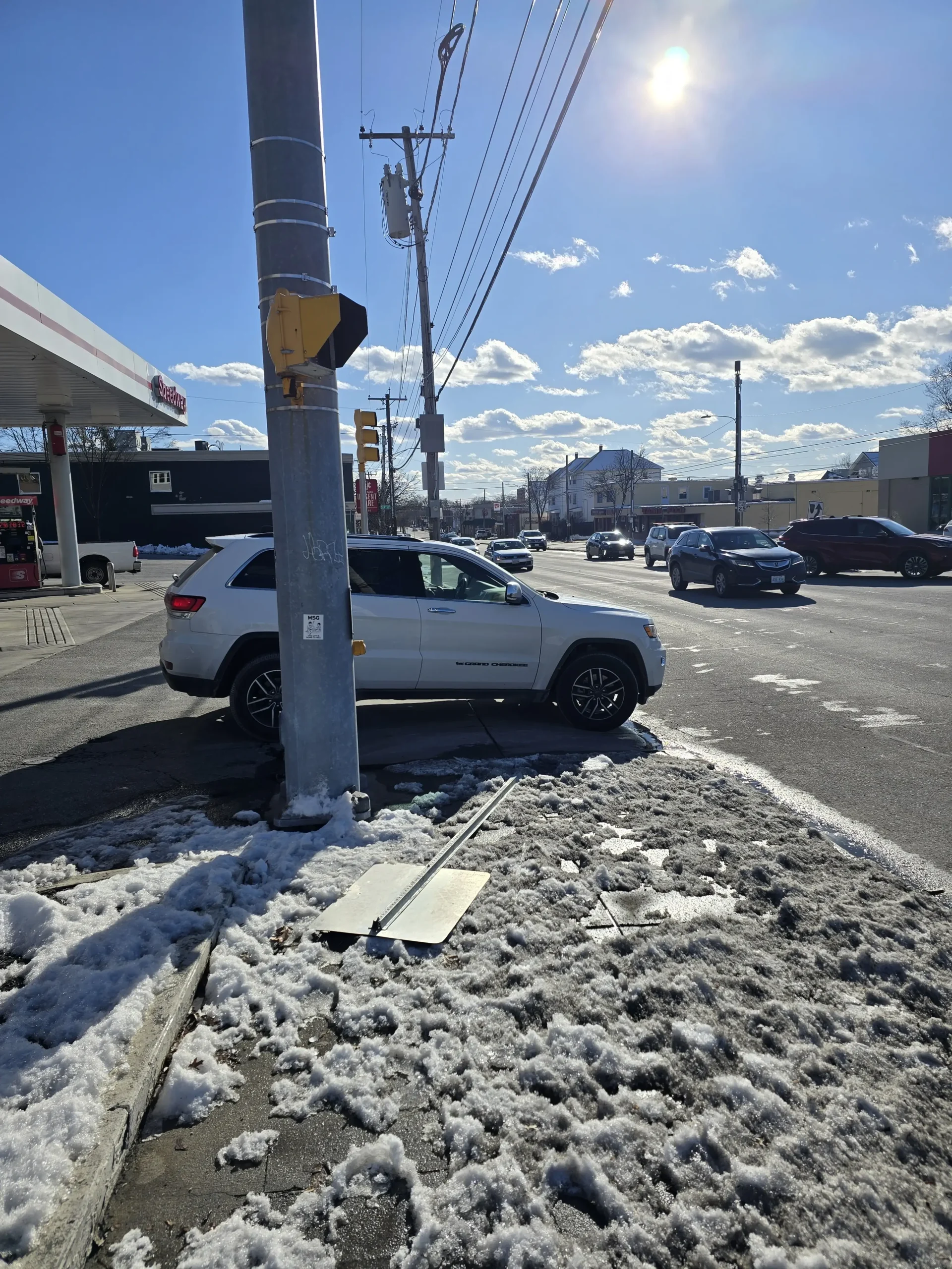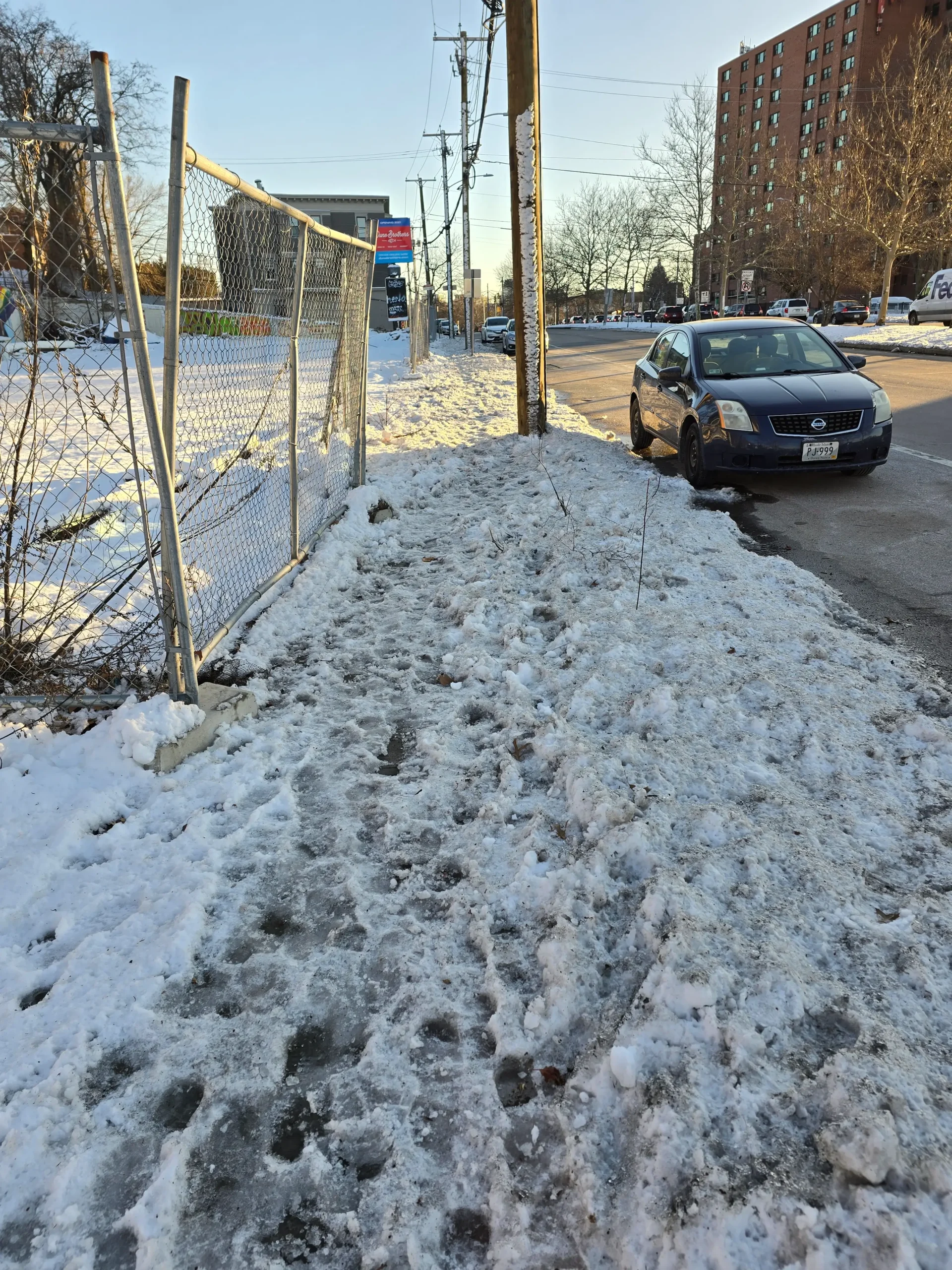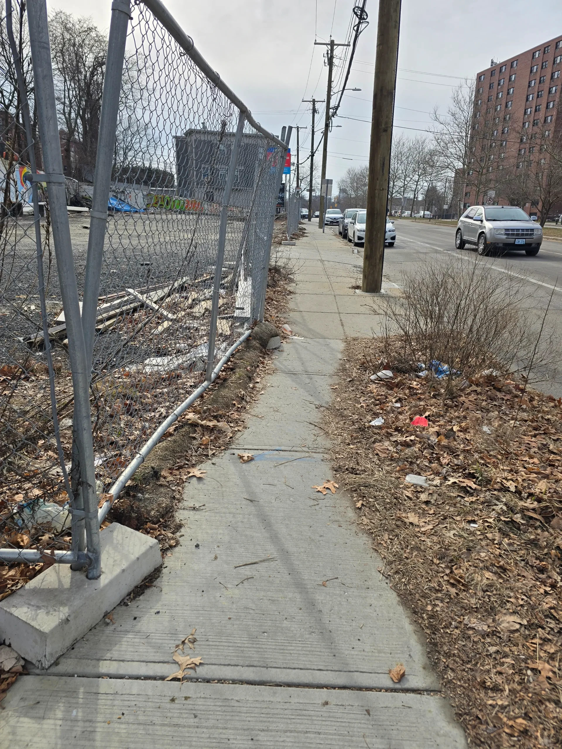 Accidents are very common, and since motorists drive quickly, they often careen into and beyond the sidewalk. Debris, such as glass and vehicle parts, are never cleared, and damage to infrastructure is seldom fixed.A newly completed pedestrian crossing signal is entirely obstructed as it was placed directly behind a utility pole.Bus stops do not have adequate shelter and are heavily damaged. Notably, the ones pictured are the nicer ones, as most do not even have a place to sit.Years-long stagnant construction materials eat away at sidewalk space, while uneven sidewalks are strewn about.In the winter months, many parts remain permanently unshoveled, often getting icy.